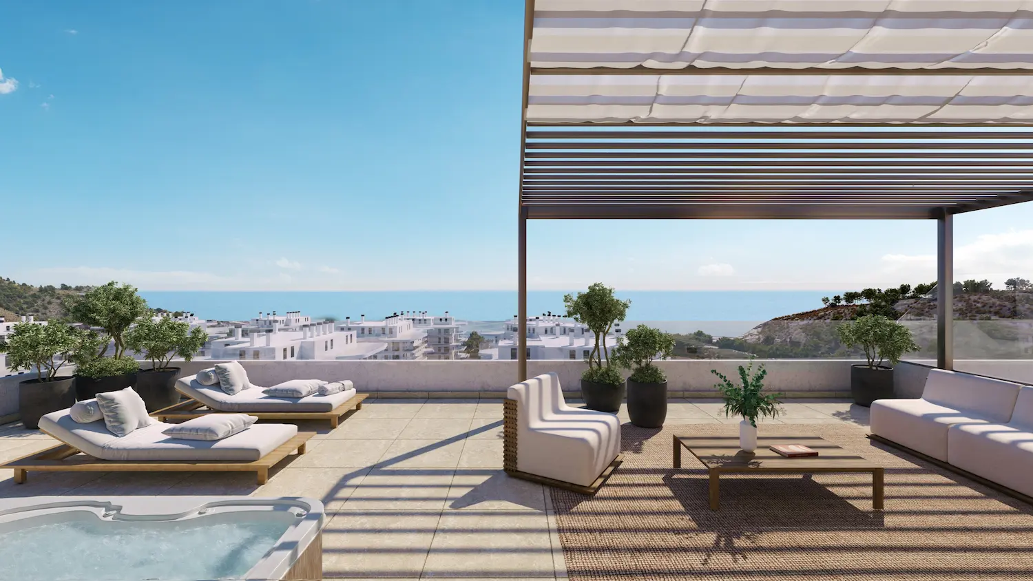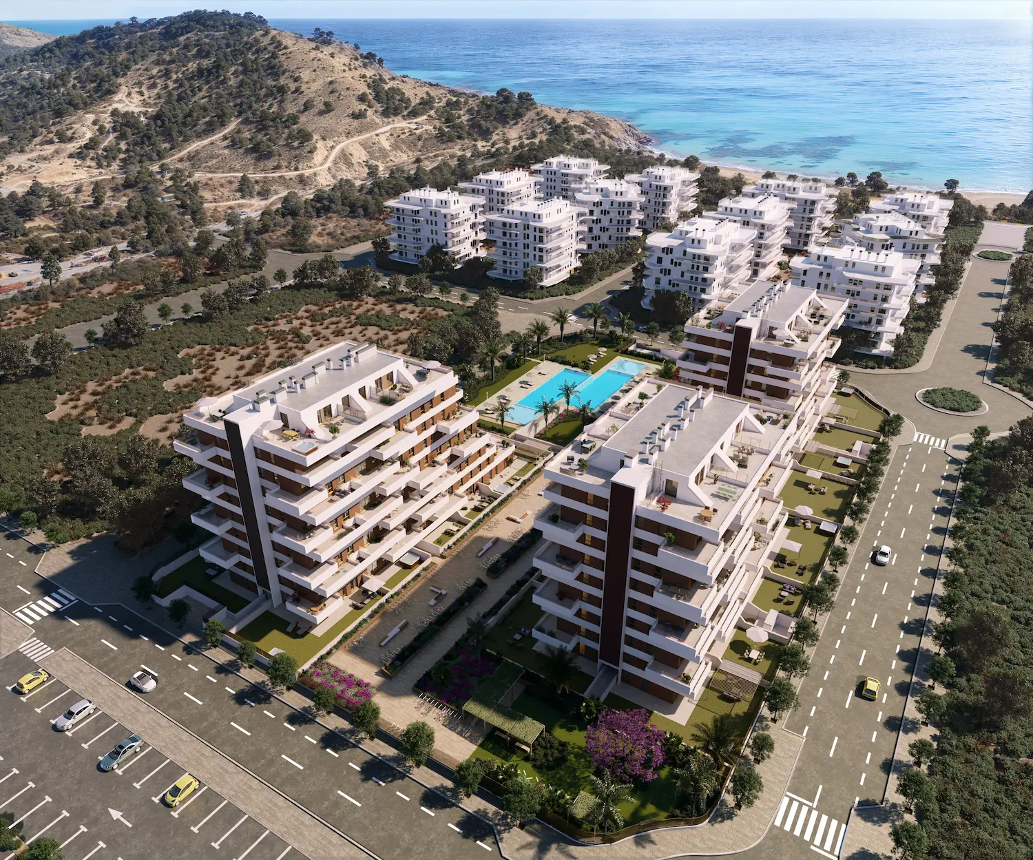 Imágenes y video diseñado para promoción inmobiliaria en Villajoyosa, resaltamos los espacios exteriores, la piscina y las zonas verdes en un entorno costero.